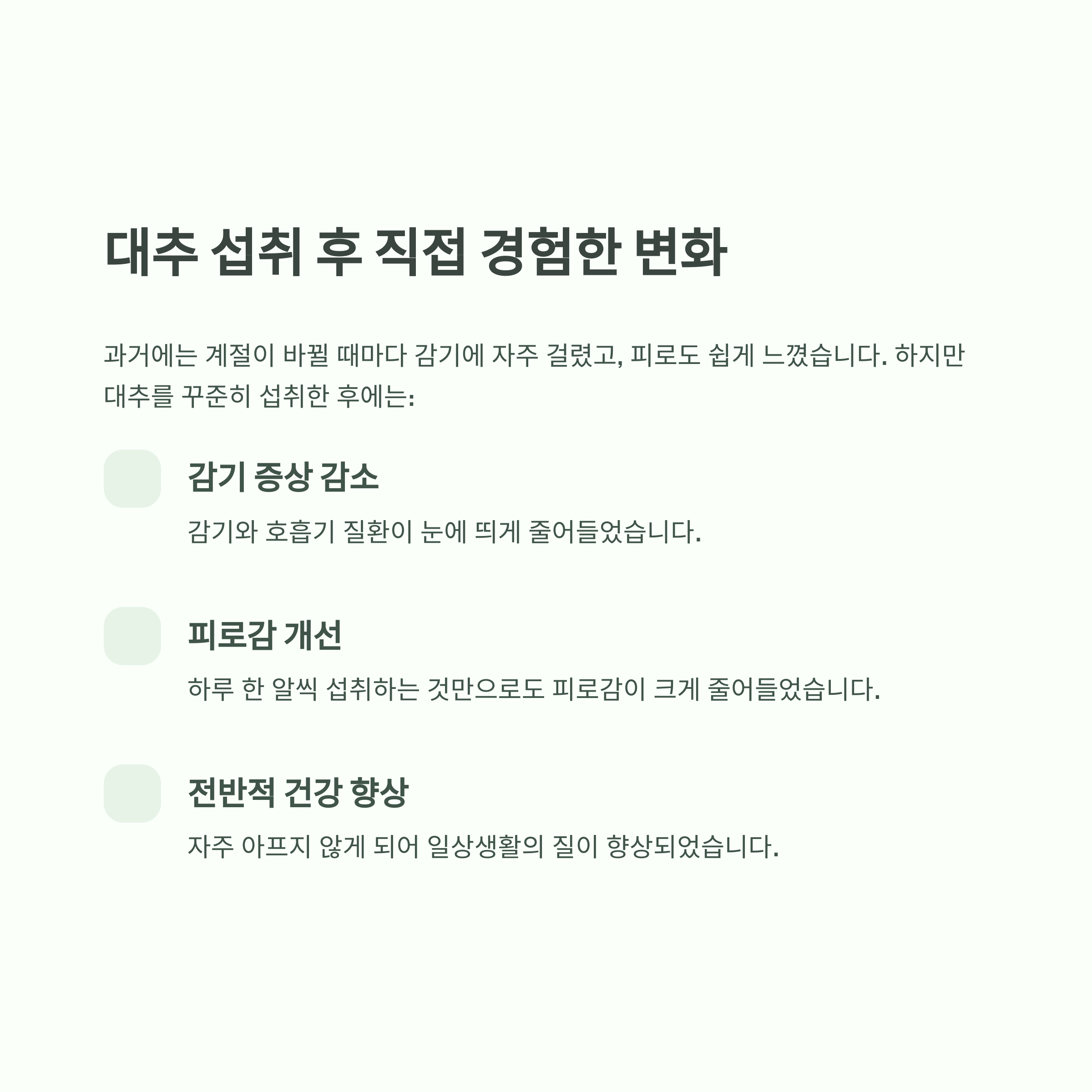 대추를 섭취한 후 저는 면역력이 눈에 띄게 개선되었고, 감기나 호흡기 질환에 걸리지 않게 되었습니다. 게다가 피로 회복에도 많은 도움이 되었어요.