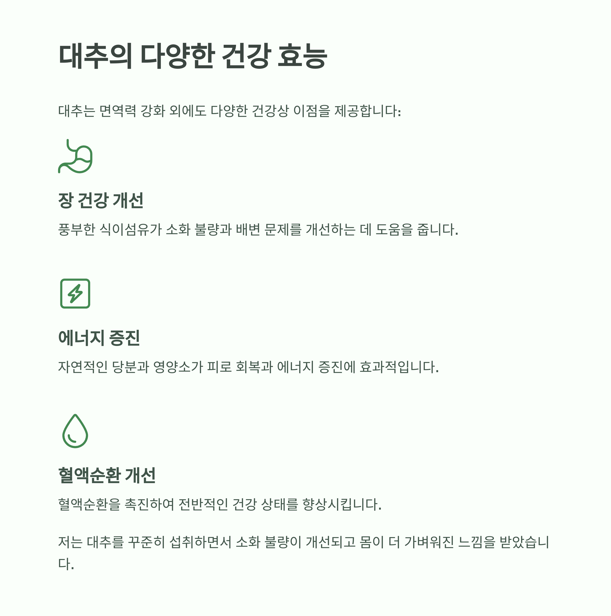 저는 대추를 꾸준히 섭취하면서 소화 불량이나 배변 문제도 개선되었고, 몸 상태가 더 가벼워진 느낌을 받았습니다.
