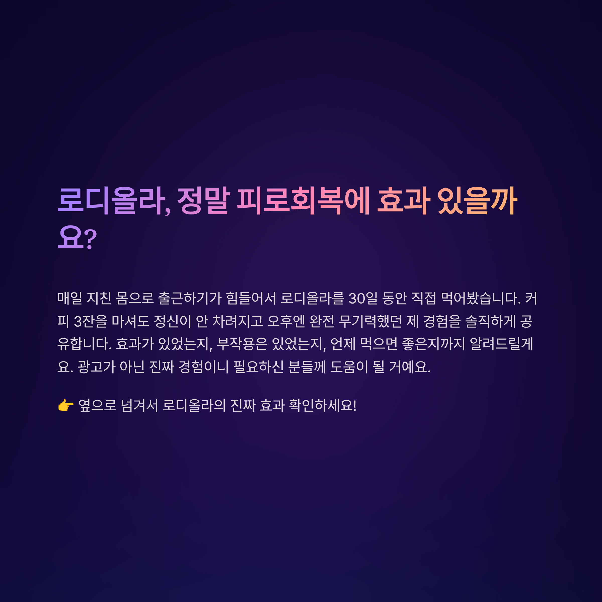 솔직히 저도 "로디올라가 피로회복에 좋다"는 말을 처음엔 반신반의했어요. 매일 지친 몸으로 출근하기가 너무 힘들어서 결국 직접 사서 30일 동안 먹어봤는데요. 효과가 있었는지, 부작용은 있었는지, 언제 먹으면 좋은지까지 솔직하게 말씀드릴게요. 광고 문구가 아니라 진짜 제 경험이라서 필요하신 분들께 도움이 될 거예요.