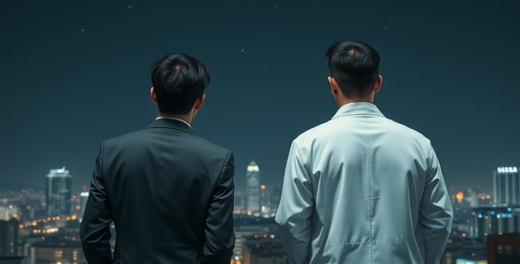 그날 밤, 민준이 혼자 병원 옥상에 올라갔어요. 서울의 야경이 눈부시게 펼쳐져 있었지만, 그의 눈에는 아무것도 들어오지 않았어요.