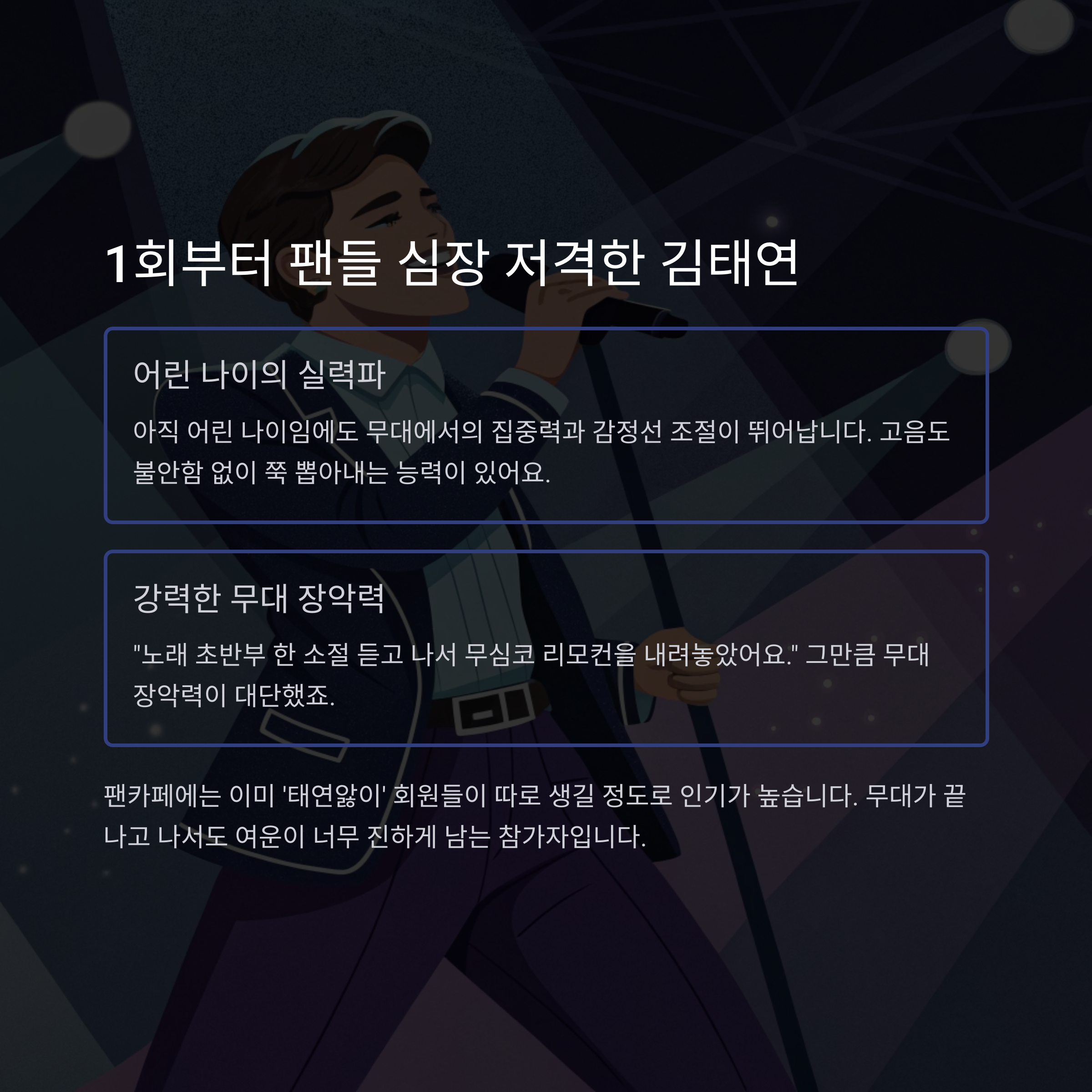 제가 첫 번째로 놀란 참가자는 방송 1회에 등장했던 김태연입니다. 아직 어린 나이임에도 불구하고 무대에서의 집중력, 감정선 조절이 말이 안 되더라고요.