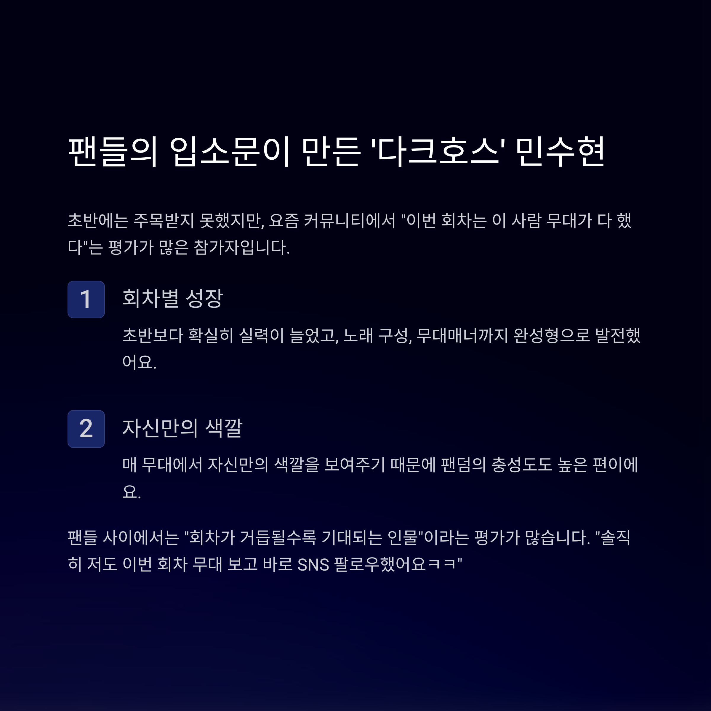초반에는 주목받지 못했지만, 요즘 커뮤니티에서 “이번 회차는 이 사람 무대가 다 했다”는 평가가 많았던 참가자도 있어요. 바로 민수현입니다.