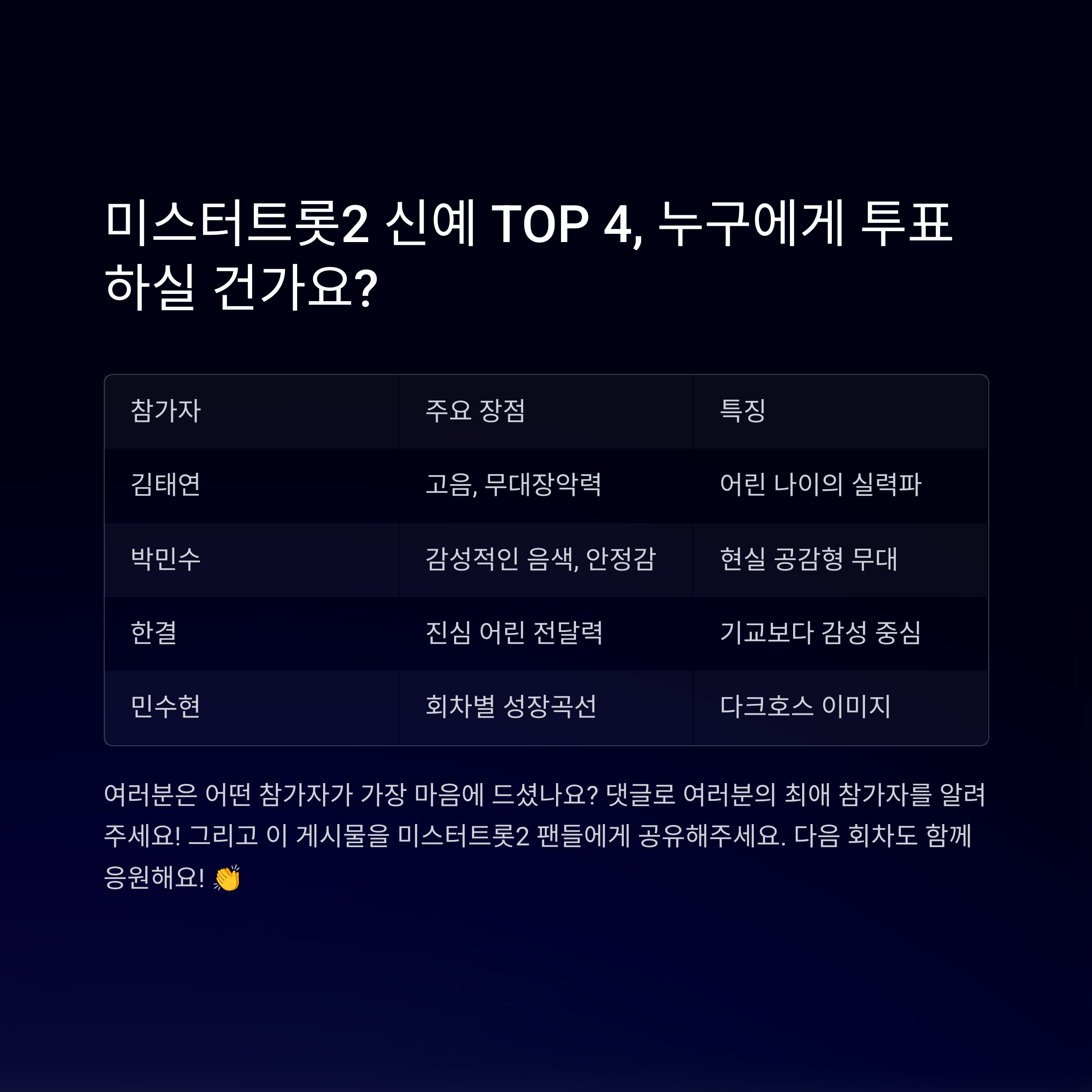 | 박민수 | 감성적인 음색, 안정감 | 직장인 출신 감동스토리 | 현실 공감형 무대 |