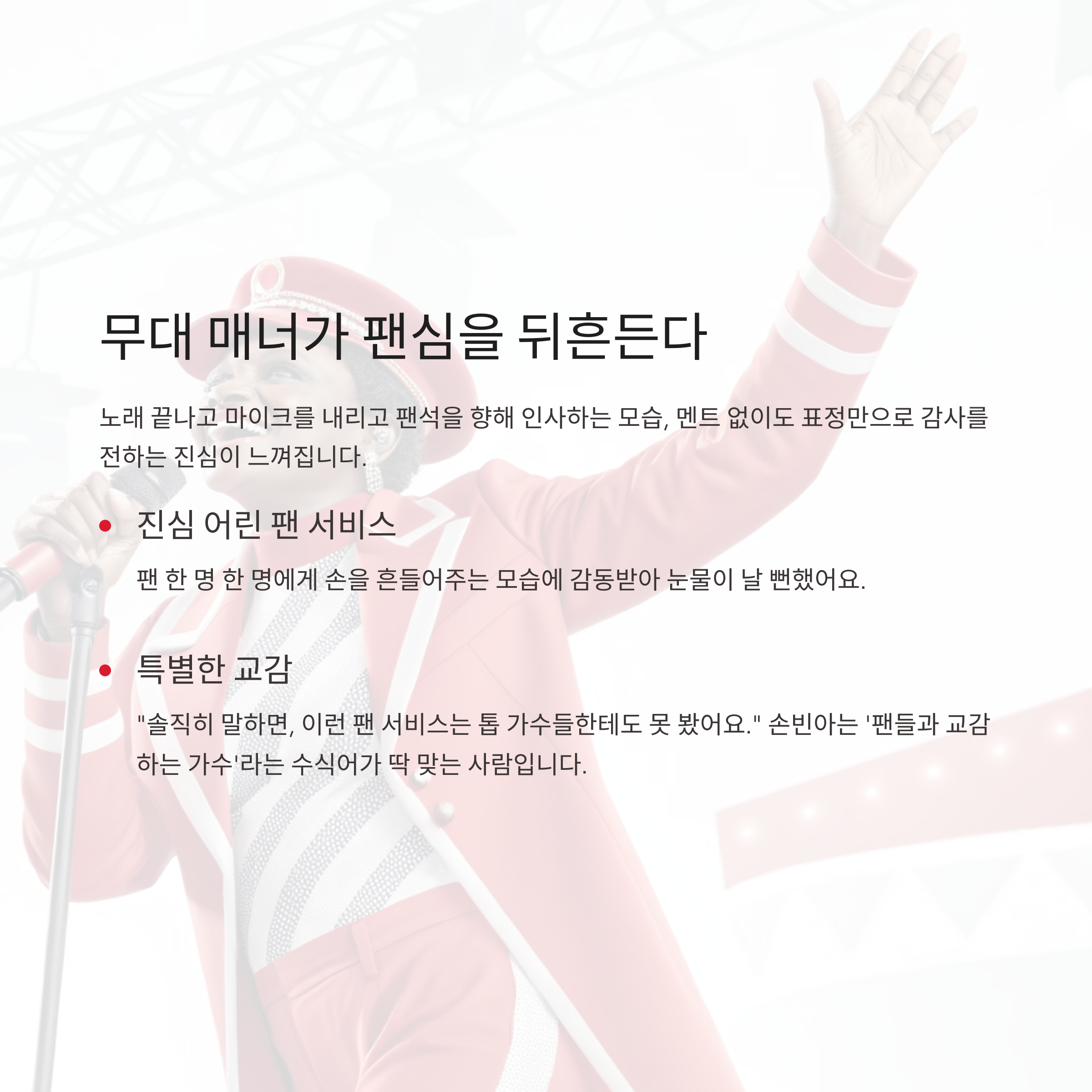 그 순간, 손빈아는 ‘팬들과 교감하는 가수’라는 수식어가 딱 맞는 사람이었어요.