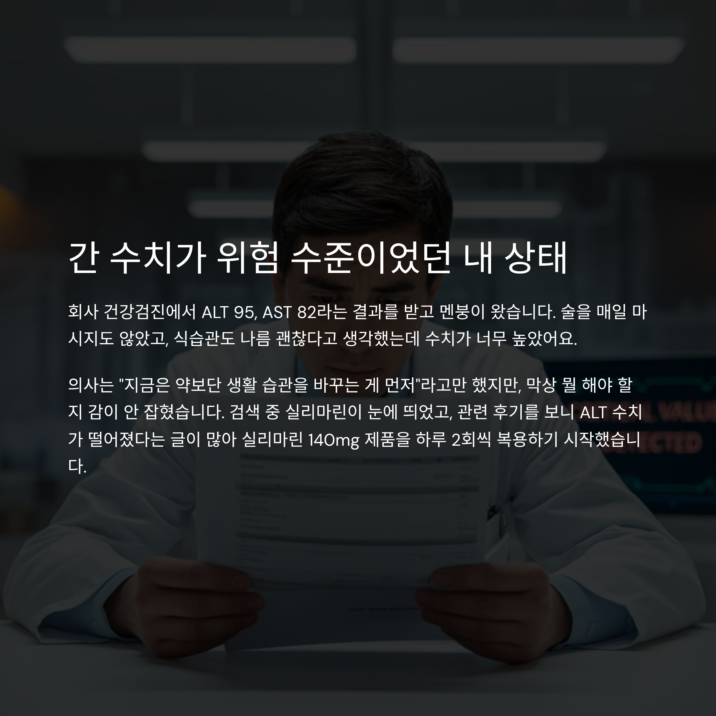 실리마린을 복용하면 정말 간 수치가 좋아질까요? ALT, AST 수치가 높아서 걱정인 분들이 많으실 텐데요. 병원에서는 “지켜보자”는 말만 반복하고, 정작 뾰족한 해답은 없는 경우가 많습니다. 저 역시 AST 수치가 80까지 올라가며 깜짝 놀랐고요. 이 글에서는 제가 직접 실리마린 영양제를 3개월간 복용하며 겪은 실제 변화와 간 수치 회복 과정, 복용 팁까지 모두 솔직하게 공유합니다.