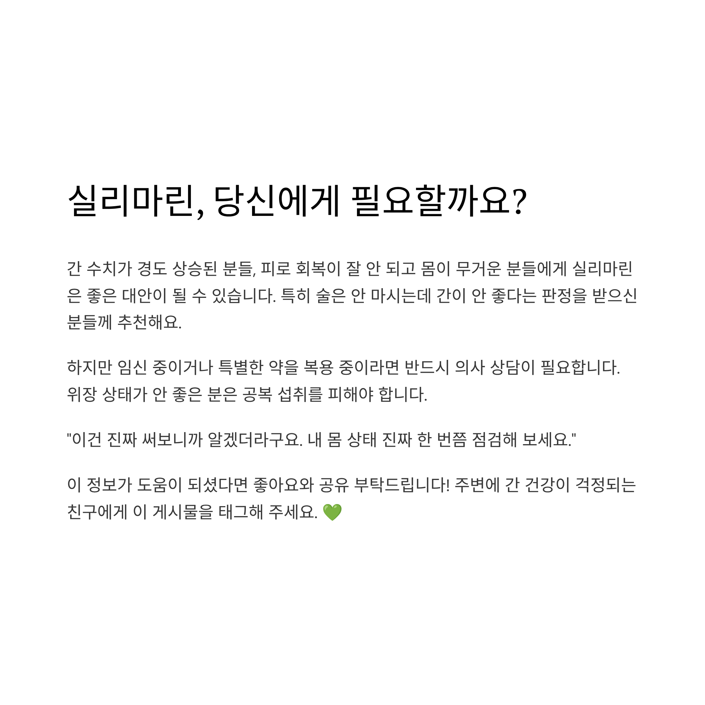저처럼 간 수치가 경도 상승된 분들, 피로 회복이 잘 안 되고 몸이 무거운 분들에겐 실리마린이 꽤 괜찮은 대안이 될 수 있어요. 특히 술은 안 마시는데 간이 안 좋다는 판정 받으신 분들, 꼭 한 번 복용 고려해보셔도 좋습니다.