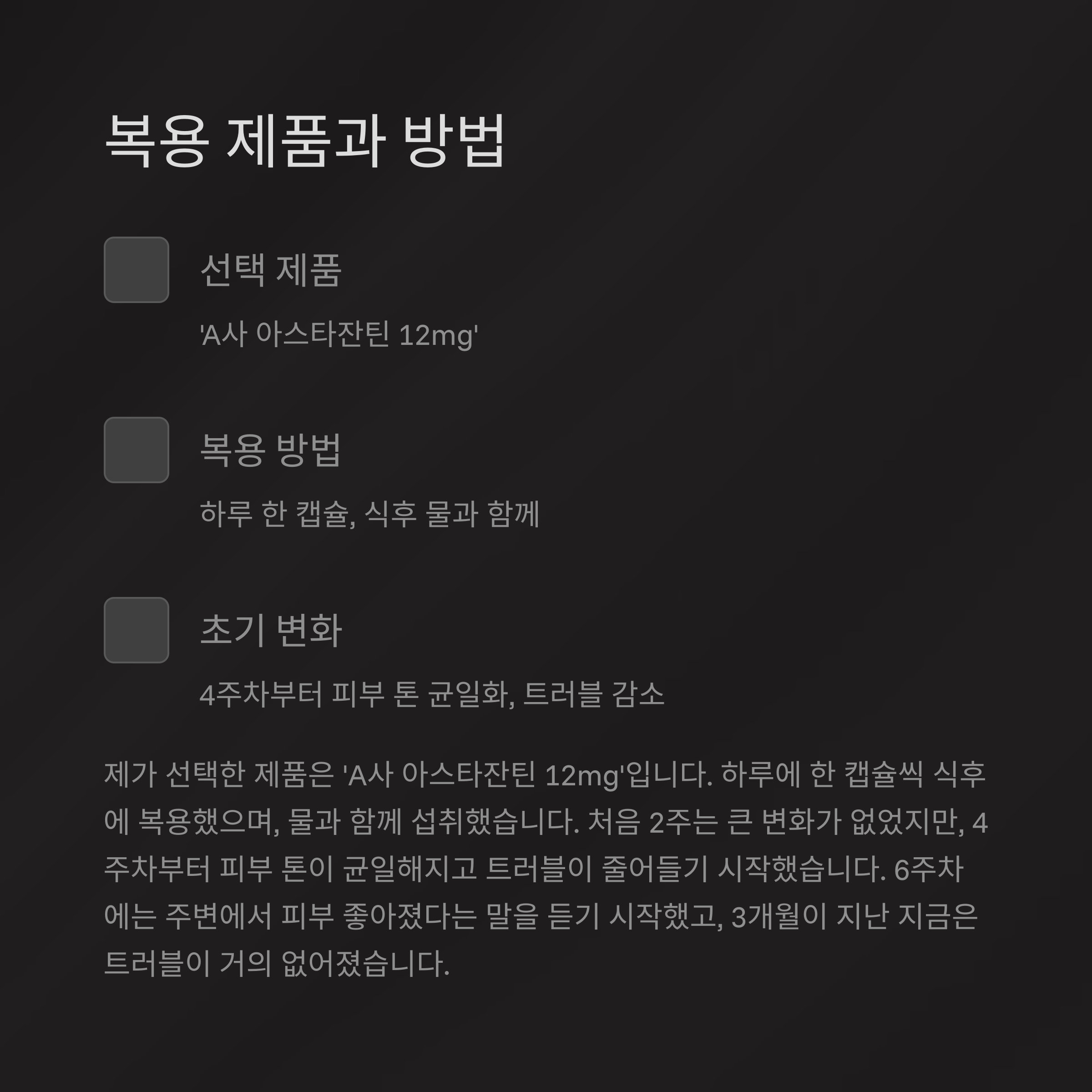 제가 선택한 제품은 'A사 아스타잔틴 12mg'입니다. 하루에 한 캡슐씩 식후에 복용했으며, 물과 함께 섭취했습니다. 처음 2주는 큰 변화가 없었지만, 4주차부터 피부 톤이 균일해지고 트러블이 줄어들기 시작했습니다. 6주차에는 주변에서 피부 좋아졌다는 말을 듣기 시작했고, 3개월이 지난 지금은 트러블이 거의 없어졌습니다.