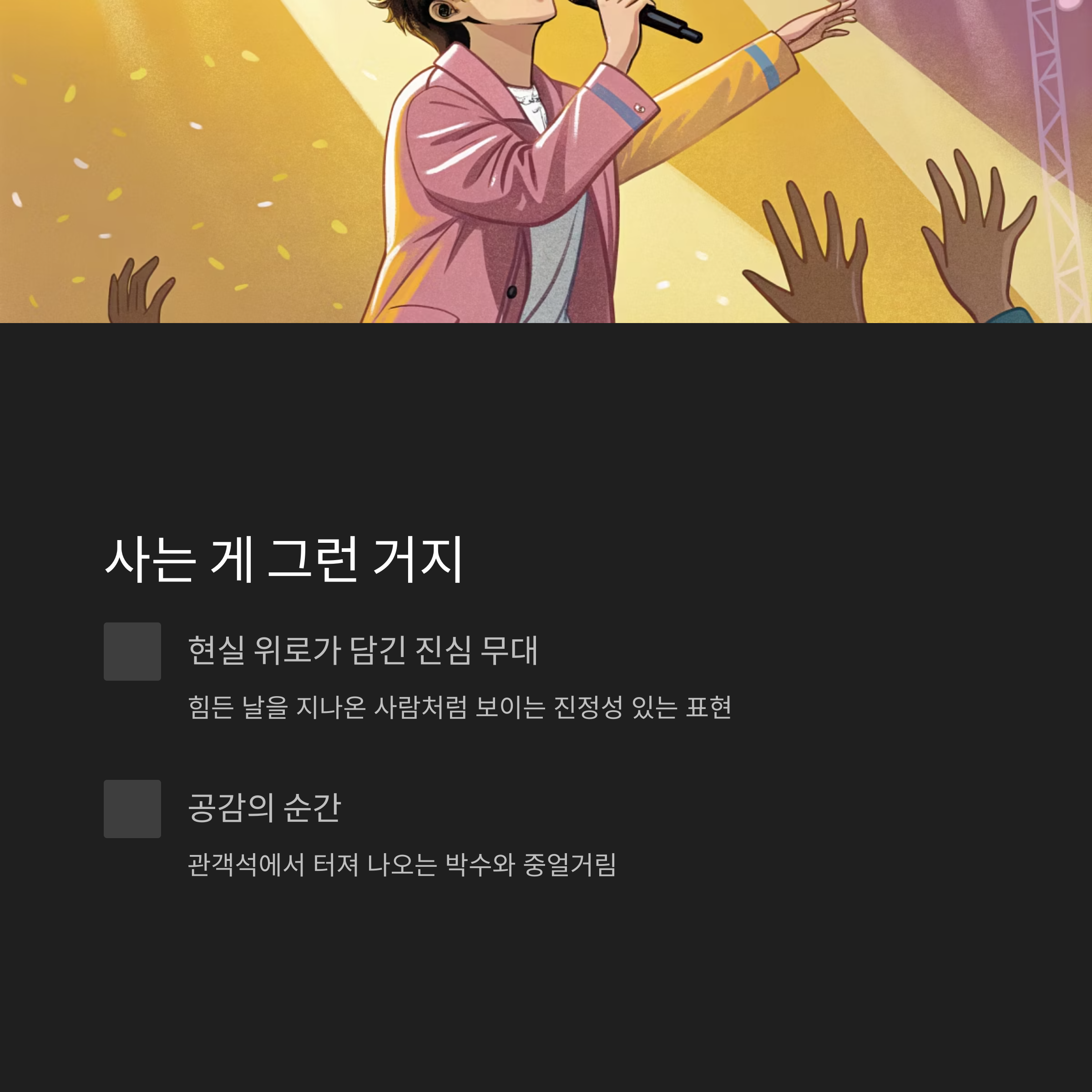 그 조용한 감정이 제 가슴 깊은 곳까지 전달돼서, 공연 끝나고 나서도 한동안 여운이 가시지 않았어요. 제가 사용해 보았는데, 이 곡은 혼자 있을 때 다시 보면 또 다른 감동이 있습니다.