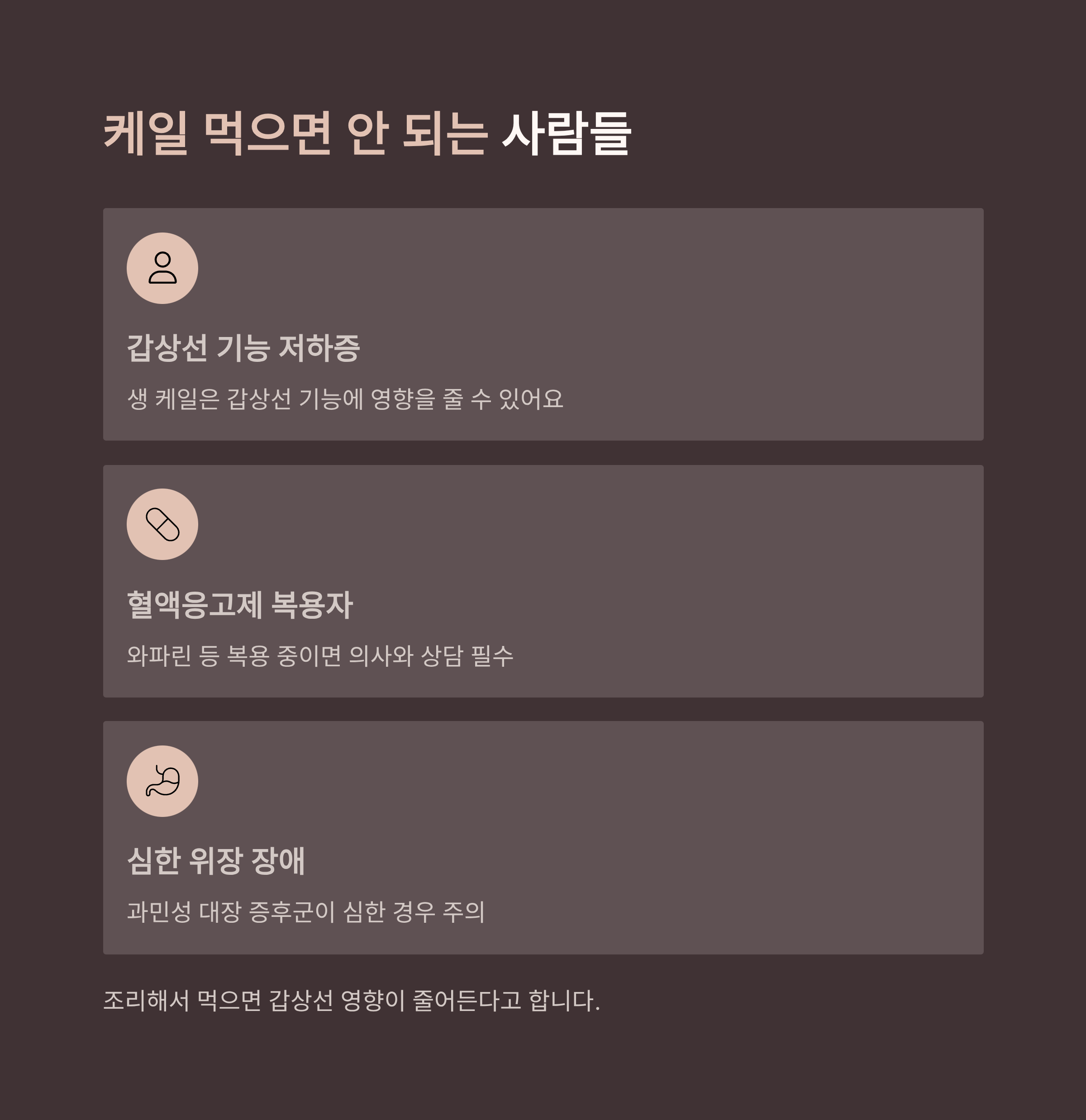 갑상선 기능 저하증 있으신 분들은 주의하세요. 저희 어머니가 갑상선 약 드시는데, 의사 선생님께서 생 케일은 피하라고 하셨어요. 조리해서 드시면 괜찮다고 하시더라구요.