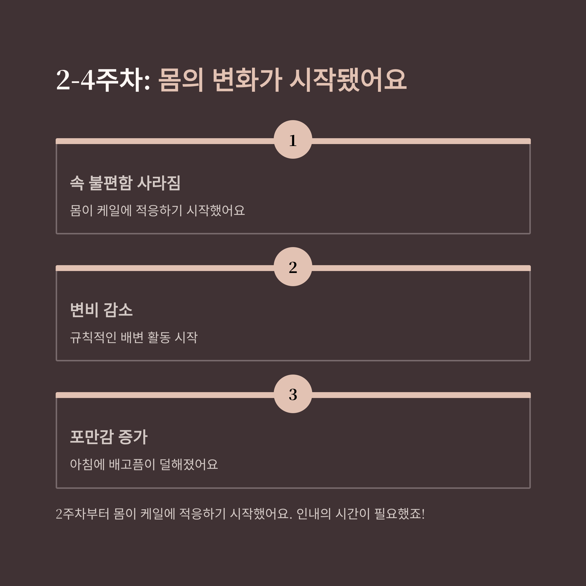 | 변비 횟수 | 주 2-3회 | 거의 없음 | 개선 |