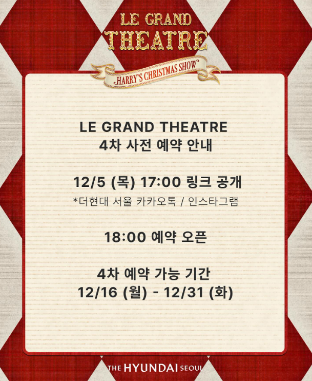 더 현대 크리스마스의 4차 사전예약 일정을 안내 해 드립니다. 12월 5일 목요일 17에 링크 공개 되오니, 미리 기다렸다가 인스타에 접속해서 빠른 예약 하시기 바랍니다.