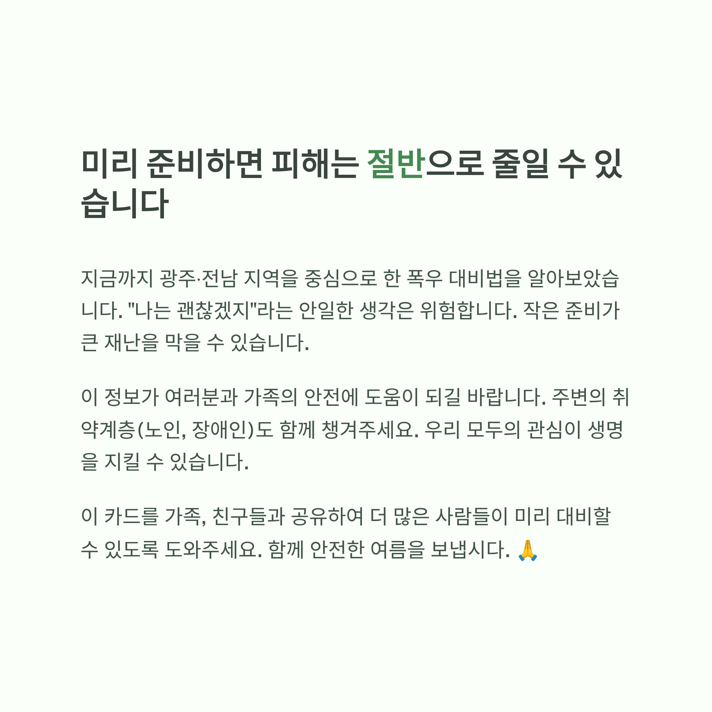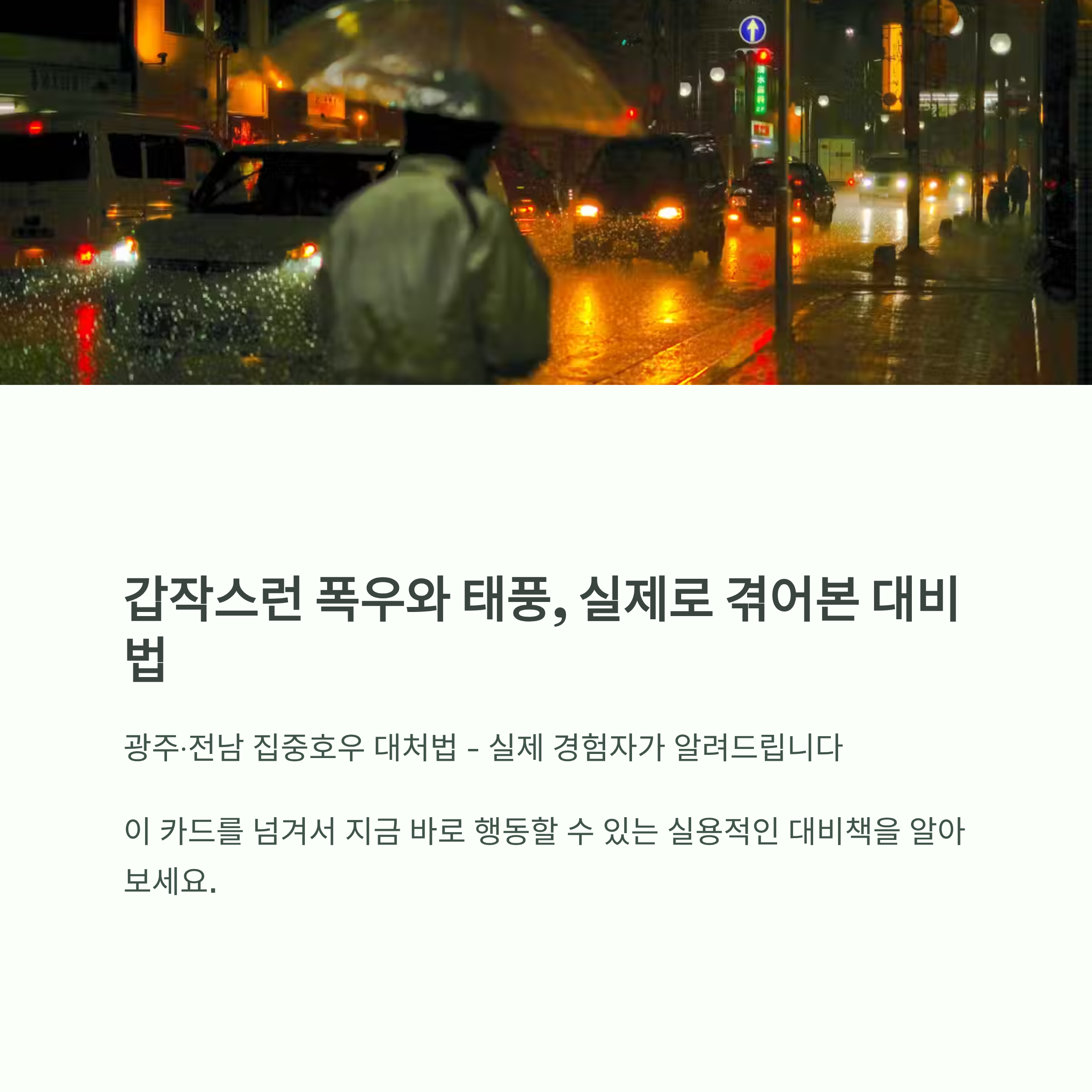 광주·전남을 중심으로 최근 집중호우와 국지성 폭우가 계속되면서 많은 분들이 “어떻게 미리 대비하면 좋을까?”라는 고민을 하고 계신 것 같아요. 특히 광양, 화순, 무안, 구례 등 실제 대피 사례가 나온 지역을 중심으로 걱정도 커지고 있죠. 이번 글에서는 제가 직접 겪은 경험과 함께, 검색량 높은 키워드로 정리한 실제 대응 방법을 공유드릴게요. 실제 사례를 기반으로 한 만큼, “막연한 대비”가 아닌 지금 바로 행동해야 할 일만 정리했습니다.