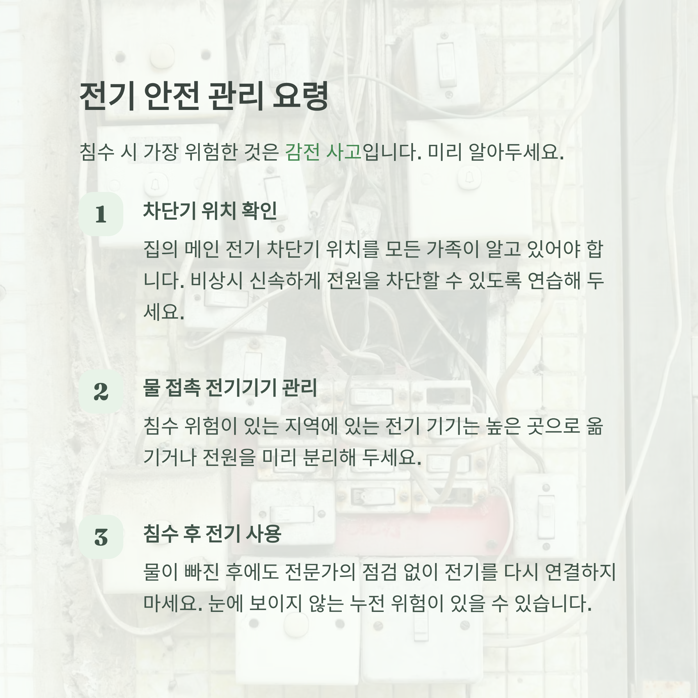 지하 점포를 운영 중이라면 반드시 전기 차단기를 내려야 해요.