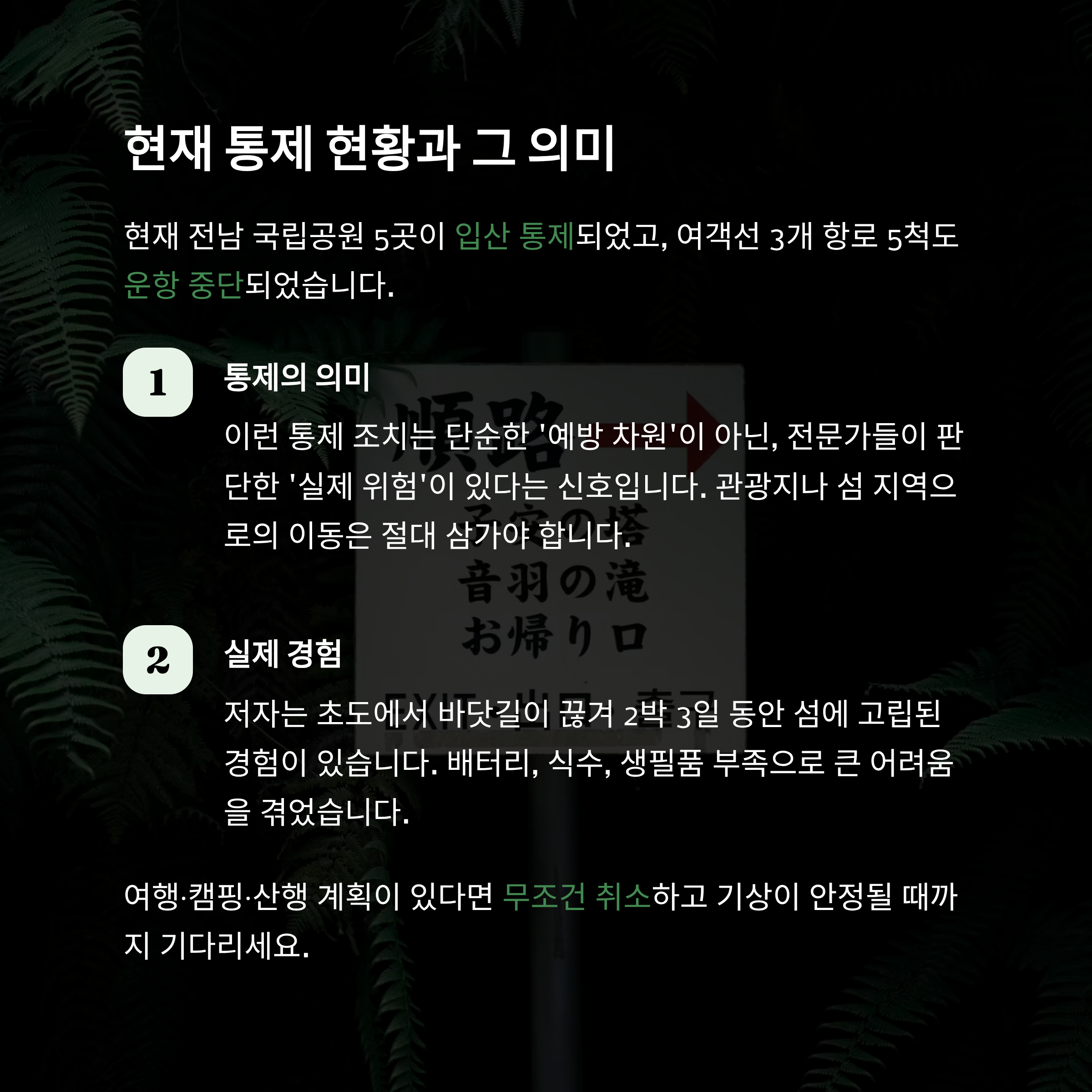 6. 국립공원·여객선 통제까지 됐다는 건 정말 심각하다는 뜻입니다
